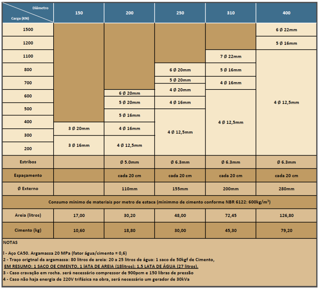 É o diâmetro de cada estaca que determina a quantidade de armadura a ser empregada nos fustes, para que os estribos permaneçam na posição correta durante a concretagem. Para isso, utilizam-se espaçadores plásticos ou em argamassa espaçados para manter a estrutura centralizada.
