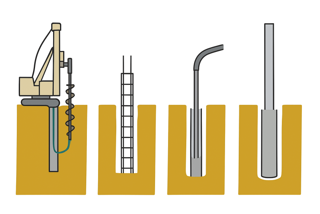 A execução de uma estaca raiz compreende fundamentalmente quatro fases consecutivas: